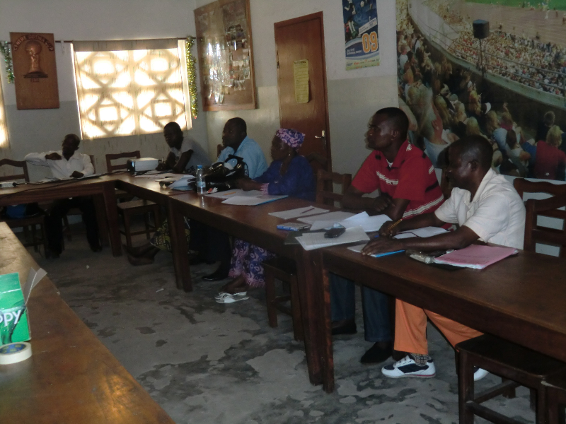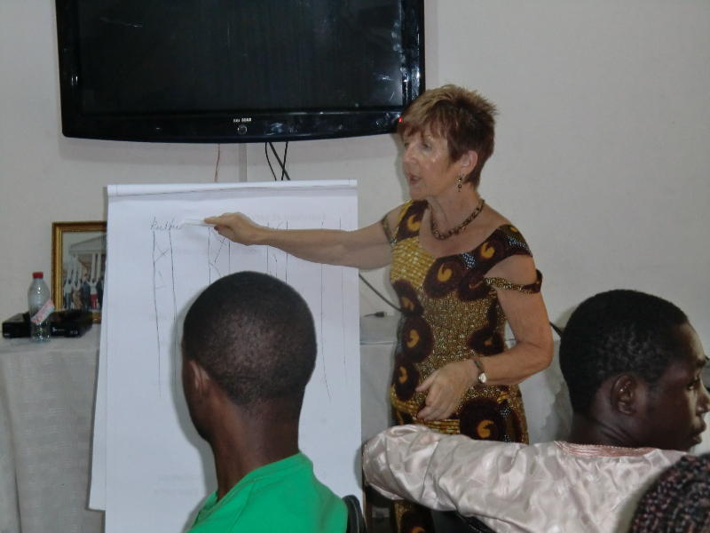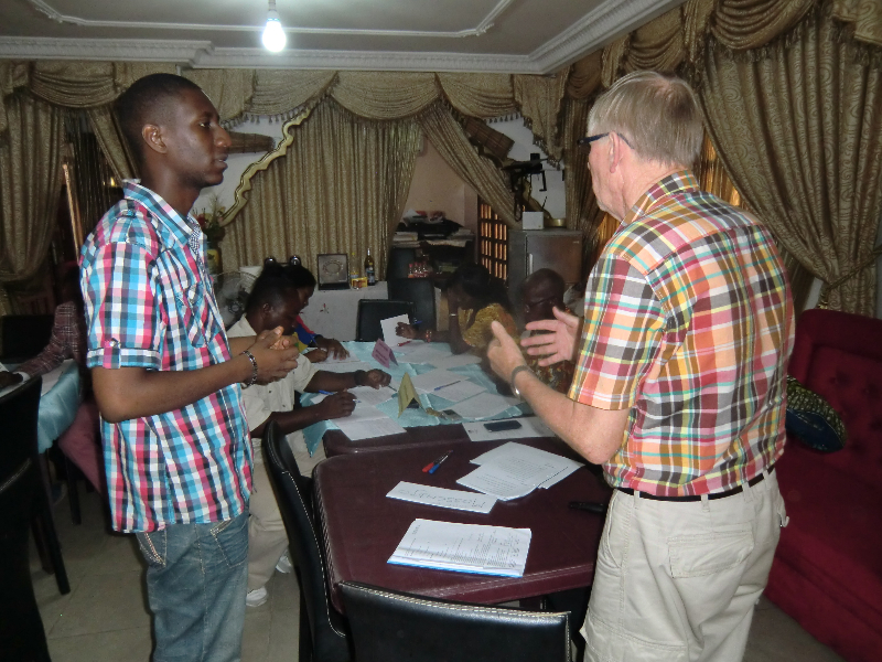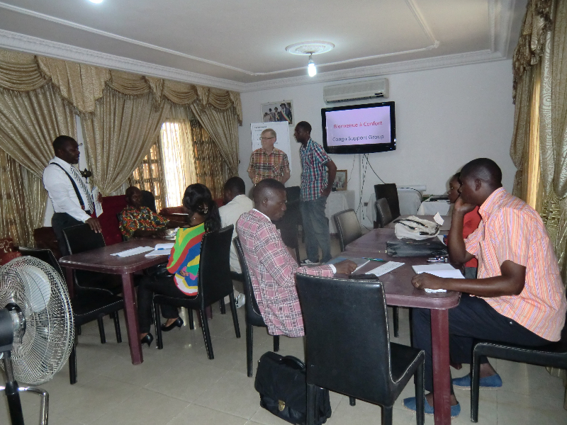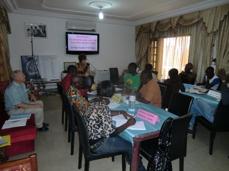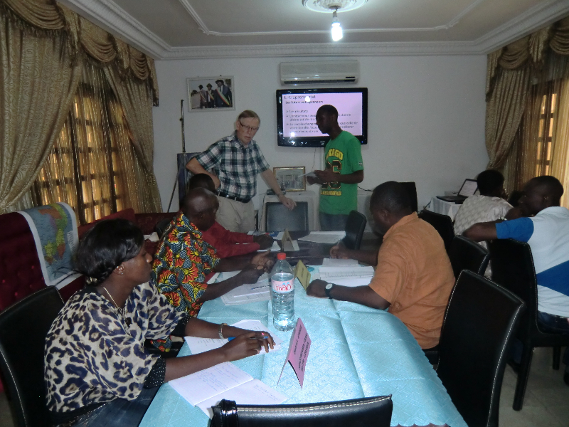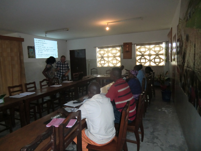 När sex deltagare hade kommit körde vi igång. Bernt och jag berättade lite om MSG och den nya organisationen här i Kongo Brazzaville, Congo Support Group. På det så tog Myriam över och ledde undervisningen. Hon fortsatte där hon slutade förra gången med personen entreprenören, vilka krav man måste uppfylla. Bernt och jag gjorde bara lite korta inlägg då och då som Myriam översatte. Hon har undervisat dem vid tre tillfällen tidigare. Myriam använde det material som hon översatt till franska. Jag hade gjort en Power Point av materialet som hon använde. Precis när hon skulle börja på sista kapitlet om att maximera inkomster och minimera utgifter gick strömmen, en inte helt ovanlig händelse, ingen överraskning och inga irritationer.