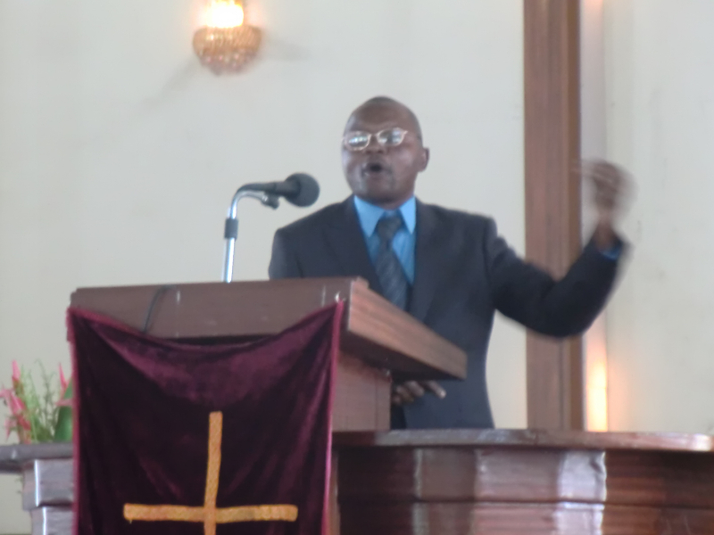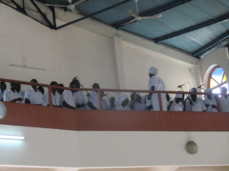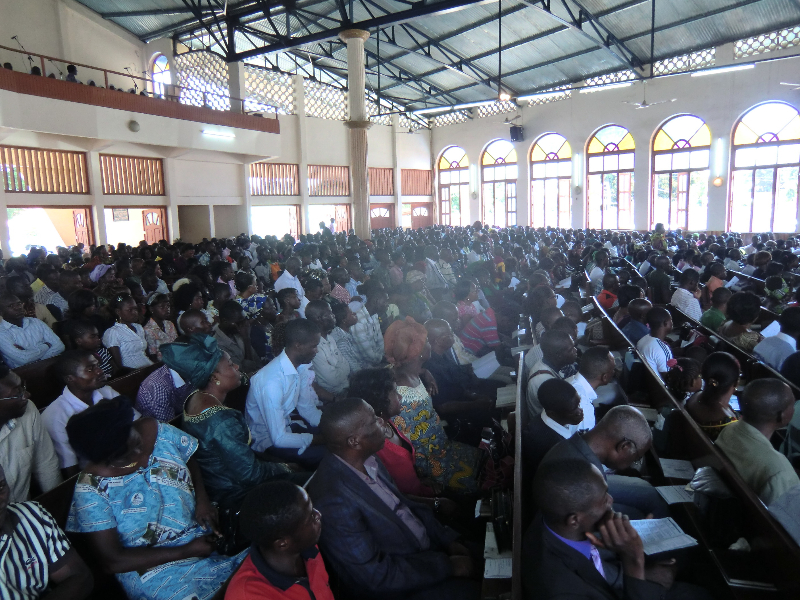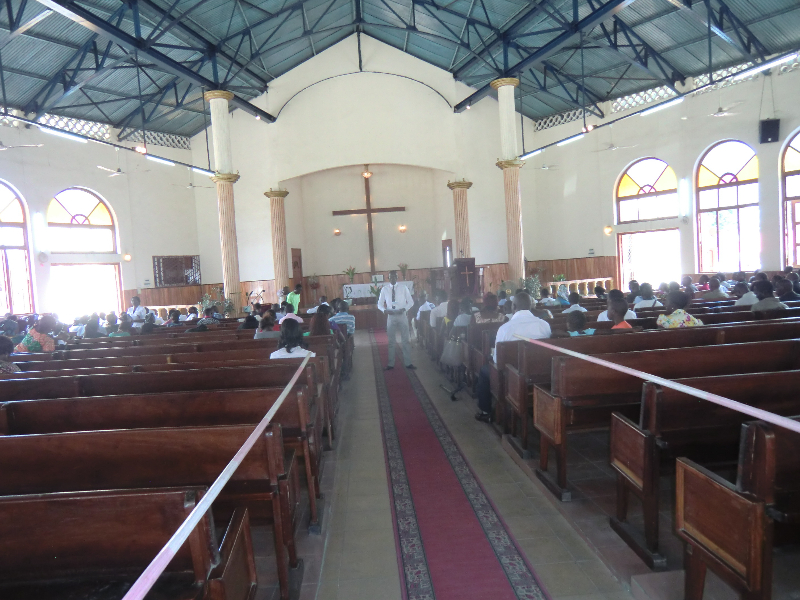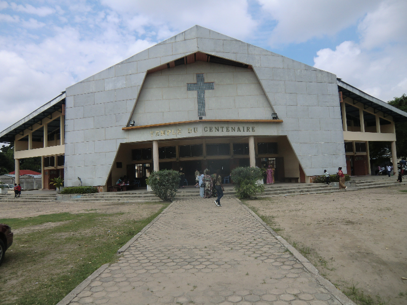 Halvtio tog vi taxi till Platåkyrkan, ett stort och stiligt tempel. Det finaste jag varit inne i, i Kongo. Skulle tro att den rymmer ett par tusen och strax efter att gudstjänsten börjat var den fullsatt. På läktaren stod kören och sjöng och deras insats var njutbar. Deras hornmusikkår medverkade ett par omgångar med marscher. De spelade också till den gemensamma sången. De hade ett finurligt sätt att fylla kyrkan framifrån. De bakre bänkarna var avspärrade till en början. När främre partierna var fyllda togs avspärrningen bort. Ett bra sätt att inte låta sengångarna gå fram i kyrkan och störa men också lätt för dem att slinka in obemärkt.