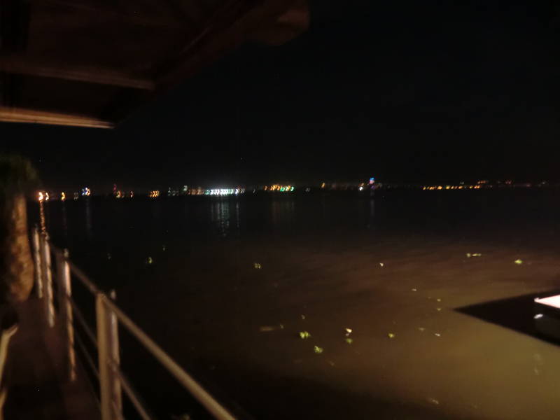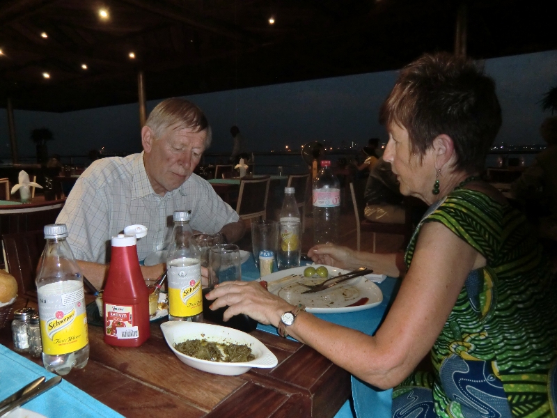 Efter dagen lektioner och lite vila for Bernt och jag med Astrid Stålberg till restaurang MAMI WATA som ligger mycket vackert vi Kongofloden. Vi satt på en terrass alldeles vid vattnet. Det blev grillad oxe med pommes frites för Bernt och mej. Astrid tog den afrikanska sakasaka med kyckling. Astrid tyckte att vi behövde komma ut lite och se stan och det kunde vi hålla med om.
