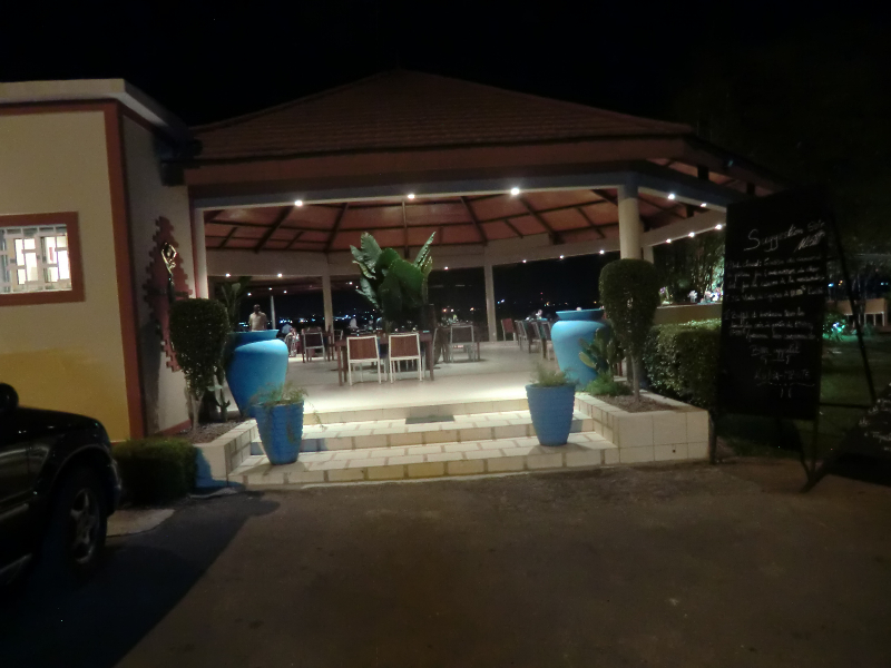 Vid sextiden blev Bernt och jag skjutsade till hotell Saphir för att äta middag.  Med chaufför och en livvakt. Han var med oss hela tiden förra gången, då i full mundering och en Kalasjnikov. Nu var han civilklädd och mindre bestyckad. Han blev väldigt glad när han fick syn på oss här på hotellet. Det blev hälsningar på kongolesiskt vis. Han vaktade dörren hela tiden medan vi åt. Här bodde vi förra gången, ett hotell med några fler stjärnor än Comfort. Det blev grillad oxfilé med pommes frites. Den satt gott för vi var ganska hungriga, vi hade inget ätit sedan frukosten, bara druckit vatten.