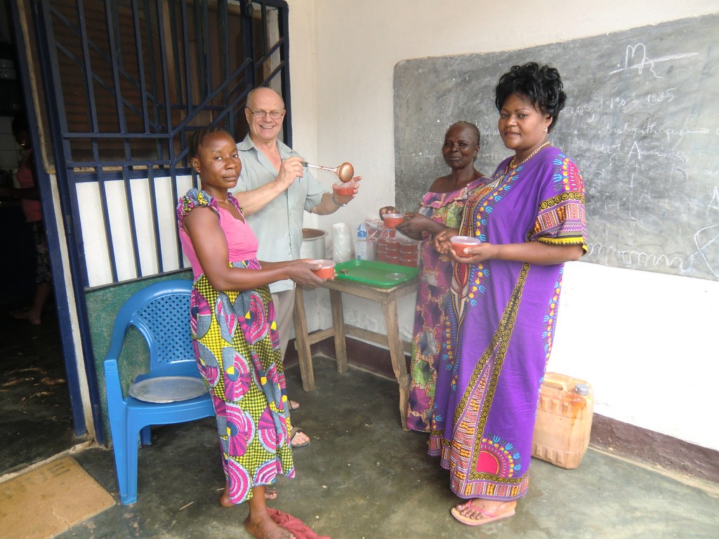 Till frukostgröten blev det hurrarop och sång och sedan blev det skivad banan på gröten. Efter frukosten kom Emy för att vi skulle fullfölja de uppdrag vi hade åt honom. Åskan och regnet avbröt oss igår, därav en del bortfall. Vi gick också igenom vår infopärm och diskuterade entreprenörer i Kimpese. Vi hade också pengar från Bikon i Borås. Dessutom fick han recept på matbröd för att utöka sitt sortiment i sitt bageri. Recepten är översatta från svenska till franska med Google Translate. Jag har upplyst Emy om översättaren. Skulle det bli galet och resultera i något annat än bröd, då skyller vi på Google.
