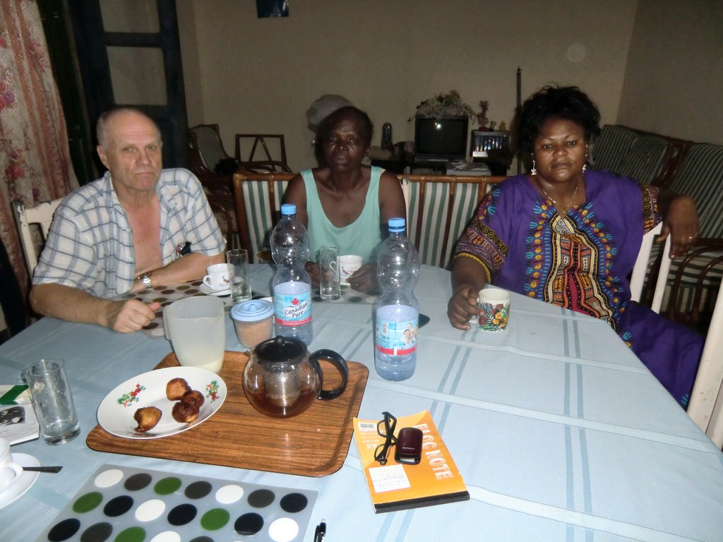 Yapeco gav sig iväg före frukosten. Han skulle till BGFI-banken med en del kompletterande uppgifter till vårt besök där, för att sedan gå igenom sin redovisning av försäljningen på sitt kontor av begagnade varor från Sverige. Strax före sju på kvällen var han tillbaka hemma. En heldag utan mat, bara vatten. Men när han väl var hemma laddade han in rejält.
