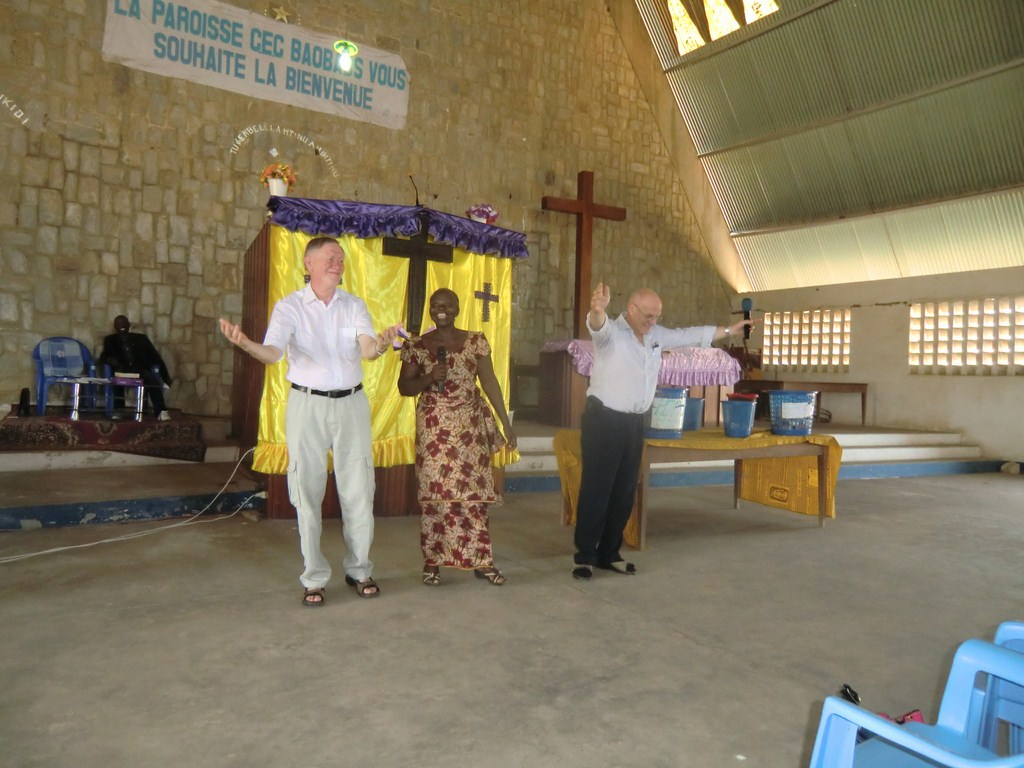 Kl 10 åkte vi till Baobabkyrkan, till kikongoversionen. Gudstjänsten följer en ganska strikt ordning i Baobabförsamlingen med en mötesledare. Den har i stort följande ordning: Bön, syndabekännelse, trosbekännelse, lovsång, gemensamma sånger som ackompanjeras med trummor vid ett par tillfällen. Orgel eller andra klaviaturinstrument finns inte, inte ens i sinnevärlden. Körsång: idag tre kvinnokörer och en manskör, välkomsthälsningar som församlingspastorn har hand om. De som är i kyrkan för första gången uppmärksammas särskilt och de från andra orter uppmärksammas också. Två mundele, Bernt och jag, togs fram och visades upp med glada tillrop och hälsningar.