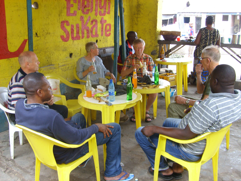 I dag var det resdag. Kl 11 bar det av till Kimpese, en resa på 24 mil. Halvvägs tog vi in hos en riktig entreprenör, en robust kvinna med restaurang, för att svalka våra strupar, härligt med kyld Fanta och Coca-Cola. Bananer och kex hade vi med oss. Medan vi intog dryck och tilltugg stekte ägaren fisk i olja till sina matkunder på sin lilla kolspis, som liknar en liten perforerad tunna som stekpannan står på. Idag har värmen varit påtaglig, en bra bit över 30 grader.