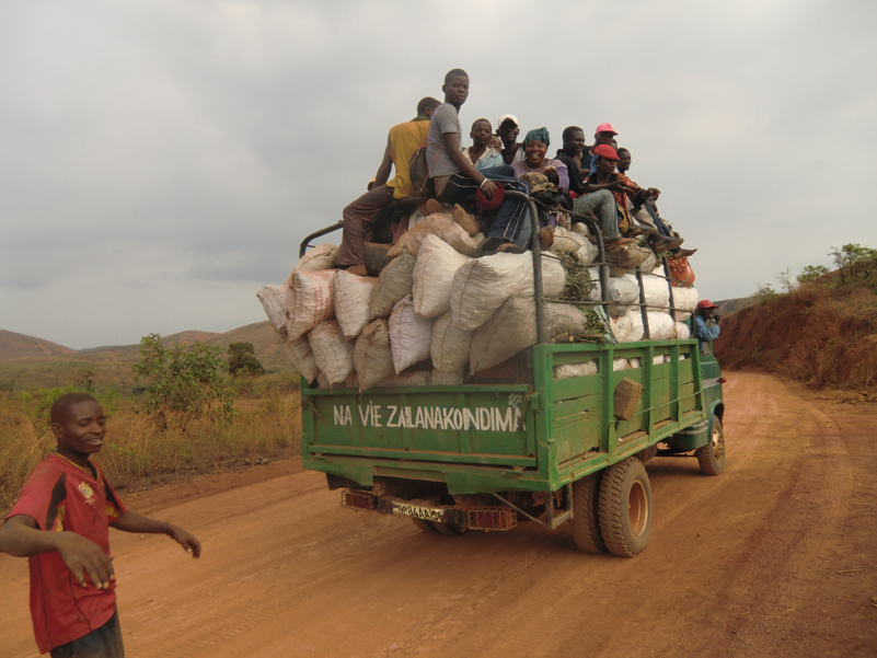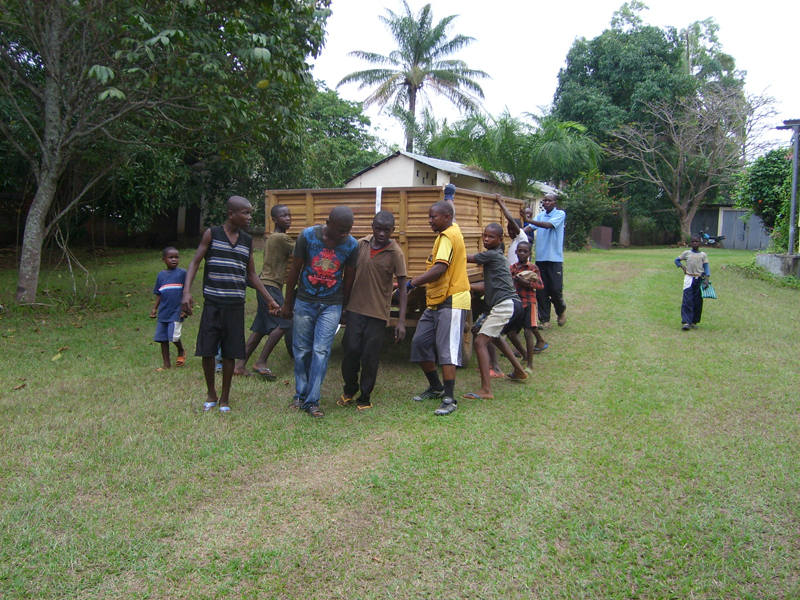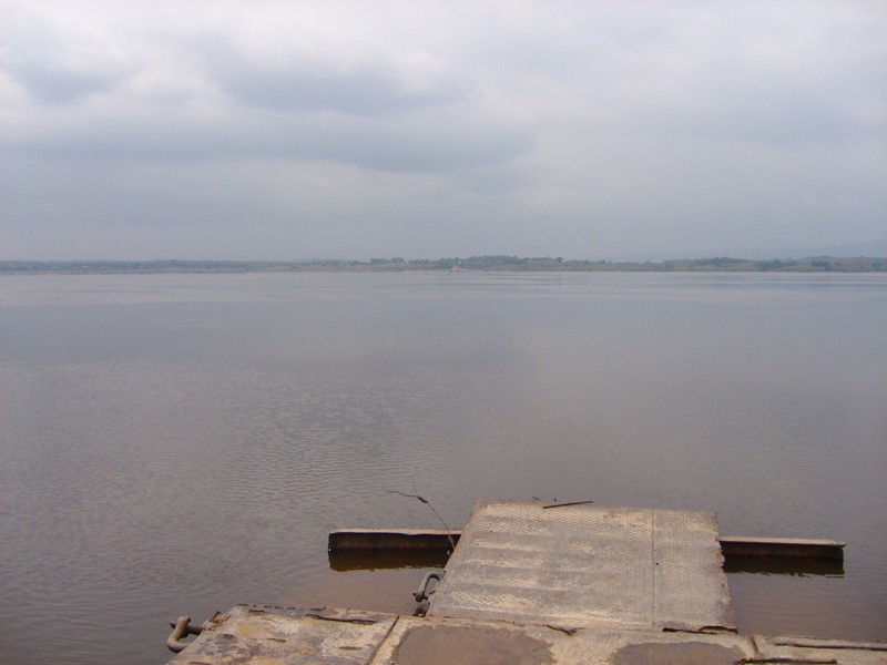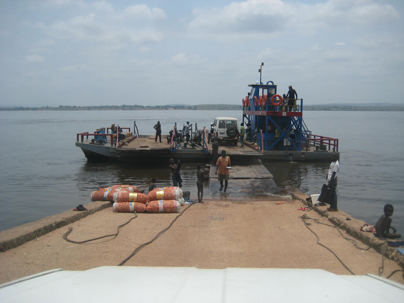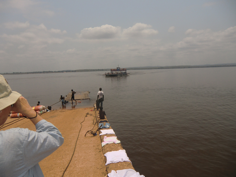 Chauffören hette Makieje och han var inte den som sparade på krutet. Han var van att köra denna väg och gjorde det på ett säkert sätt. Men det gick aningen fort. T.o.m. Yapeco tyckte att han kunde ta det lite lugnare. Vi som satt på sidobänkarna längst bak var nästan lika mycket ovanför bänken som på den. Det blev en skakig resa och vi var rätt mörbultade när vi var framme i Kimbemba vid Kongofloden. Då lastade vi ur allt pick och pack, en alldeles för stor börda att släpa på. Vi satte oss på färjerampen och inväntade färjan, en katamaran. Nu var det den nya färjan igång igen, sist vi åkte över var den nya trasig då tjänstgjorde den gamla, en ganska enkel variant.