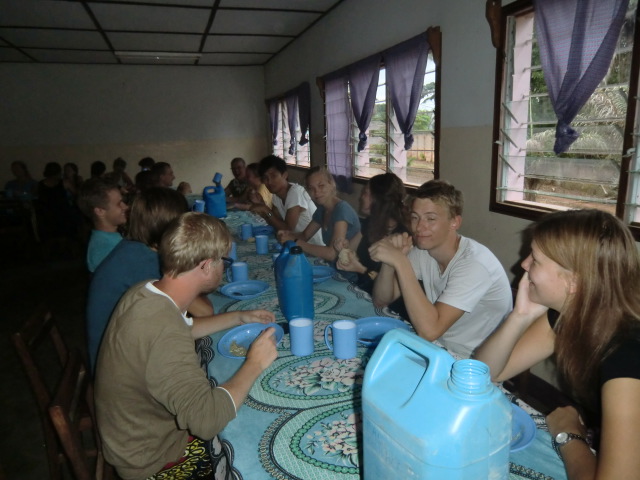 Till kvällsmat blev det te och bröd med frukt, papaja, vattenmelon och bananer och rundade av med beigner – en flottyrkokt bulle – smakar mycket bra. När jag skriver de här raderna är jag ackompanjerad av pratsamma mundele runt matbordet.
