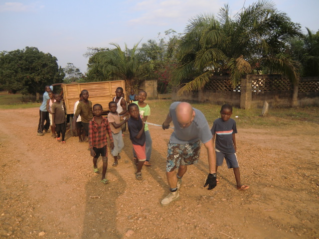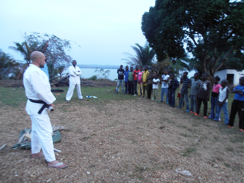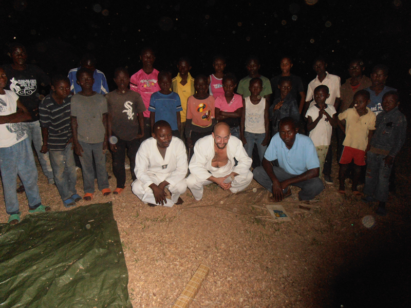 Christoffer har tillsammans med 50 barn och ungdomar byggt en dojo som är en träningsplan för judo 10×10 m. Först ett par cm sågspån, sedan ett täcke av palmblad och på det 15 cm agnar. Slutligen täcks allt med en duk som han köpt av några sömmerskor. Sågspånet och agnarna lastade de på en stor vagn, det blev fyra lass och vagnen drog de för hand ungefär en kilometer. I morgon kl 16 drar träningen igång.