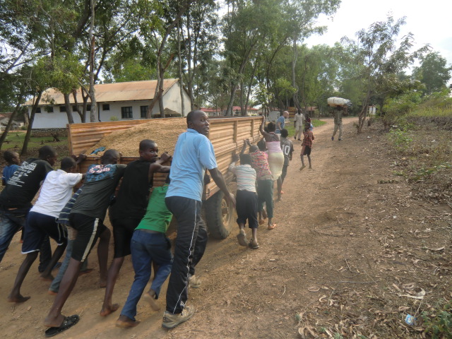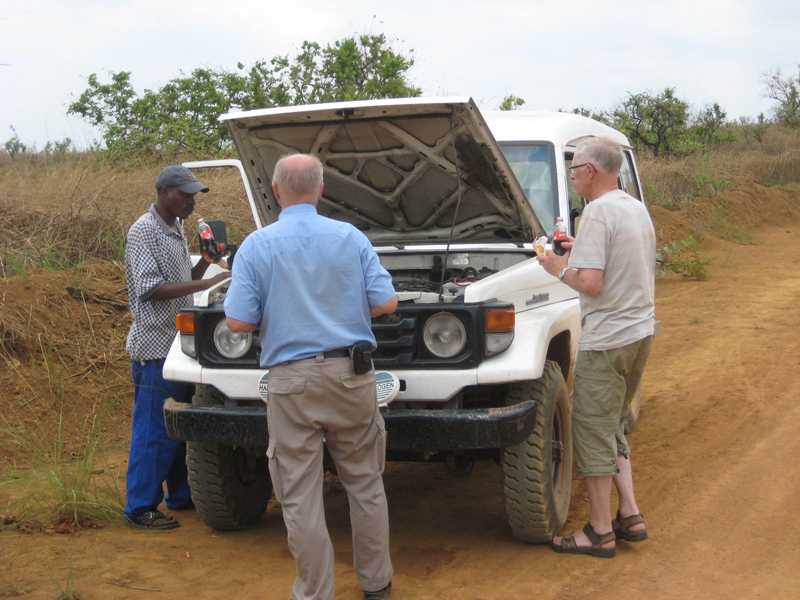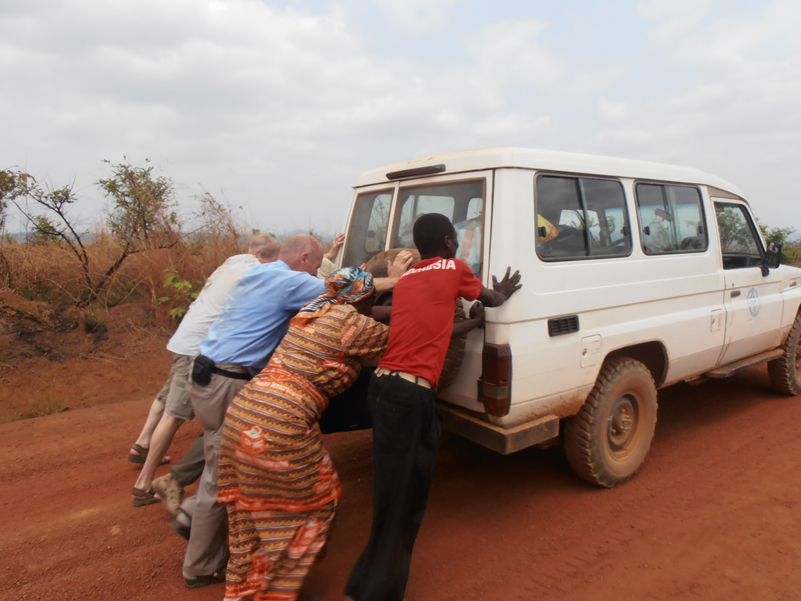 Något mer än halvvägs till Kimpese stannade bilen och helt omöjlig att få igång. Startmotorn drog dåligt och motorn nekade att starta. Vi lät bilen ta igen sig en stund. Att vara bil i Kongo är inget lättsamt, de får verkligen visa vad de går för, den behövde säkert en liten paus. Under tiden tog vi en dricka och lite kex som vi hade med oss som vägamat. Efter en stund kom vi överens om att försöka skjuta igång bilen. Framför hade vi 100 meter motlut som vi funderade på om vi skulle klara få den över krönet. Vi tog spjärn alla åtta och sköt på allt vi orkade. Vi lyckades att komma över krönet och på andra sidan var en härlig nedförsbacke. Bilen satte fart och motorn startade. Underbart!!