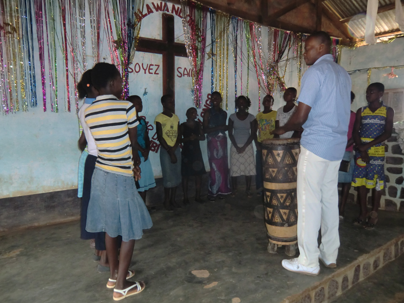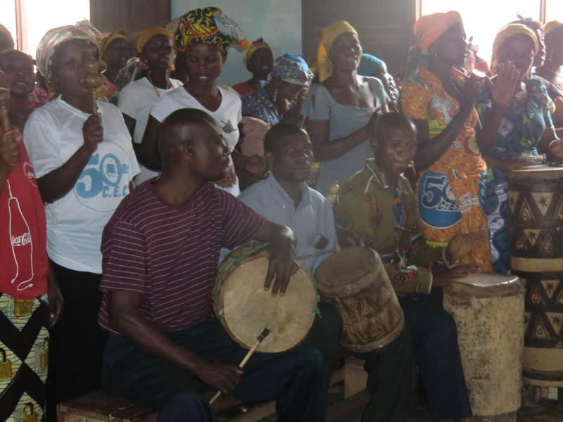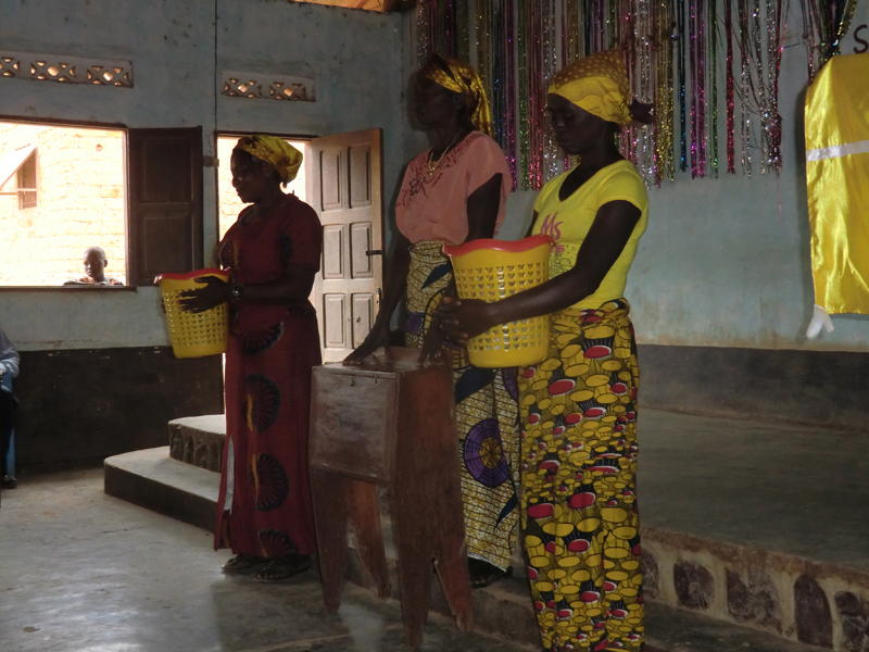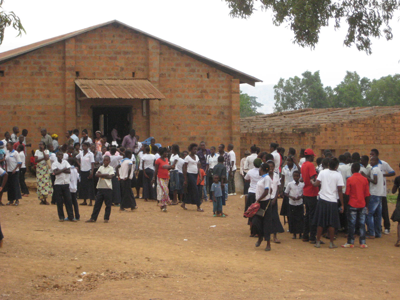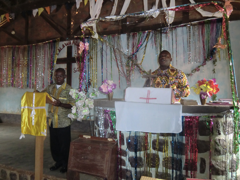Kyrkan var mer än fullsatt, omkring 300, sju körer sjöng, en kollektupptagning som var lite utöver det vanliga; till kyrkbygget som de byggt på i nio år, till den nationella CEC-kyrkan, till sjuka och så kollekt till församlingen, då respektive sida hade sin kollektkorg, sidorna tävlade vem som lade mest. Bland de insamlade medlen fanns en höna och jordnötter, en kvinna gav en liten handväska, troligen det enda hon hade med sig. Här kan man tala om änkans skärv som var mer värd än dollarstinna västerlänningars gåvor. Hon gav det enda hon hade medan de andra gav av sitt överflöd. Väskan auktionerades ut med det blev inget bud, den får ligga till sig till nästa vecka. Tuppar finns i rikligt antal i Kongo, utanför stod det en kyrktupp och höll låda med jämna mellanrum. Ett litet tecken på att kyrkan och gudstjänsten är mitt ibland människorna och det som händer i byn. Här får både människor och djur låta sin stämma bli hörd.