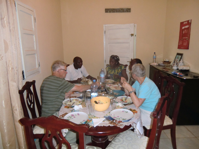 I Kimpese blev vi översvallande välkomnade av Nganga med fru Nsiki. Ett härligt pensionerat par. De har två döttrar och tre söner. Äldsta dottern bor med sin familj i New York och äldste sonen i Paris. Yngsta dottern kom hem och hälsade på oss. När vi kom in här så kunde vi konstatera att Kongo är kontrasternas land. De har ett fint hus med luftkonditionering. Vi kommer alltså fem svenskar och Yapeco. Först fick vi dricka oss otörstiga med tre sorters juice, lite senare blev det middag med stekt kyckling, ris, potatis, maniok, tomater och andra för mig okända grönsaker, men goda, till dessert bananer.