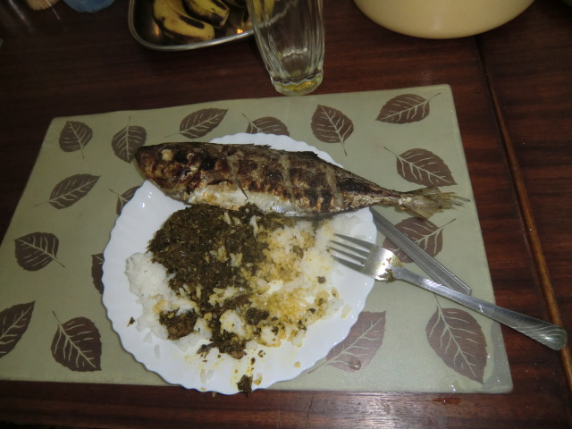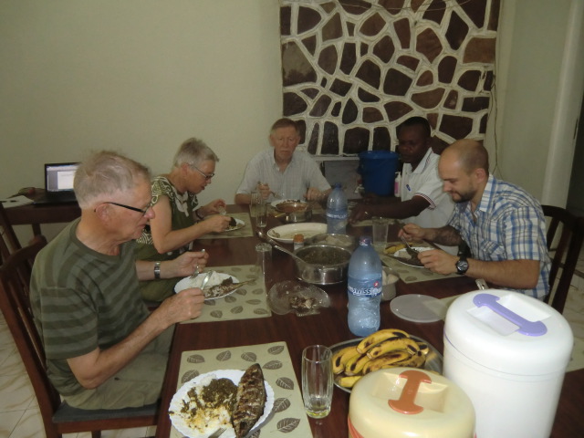 De övriga i gänget gjorde en sightseeing på stan medan jag stannade hemma och gjorde lite uppdateringar på webben och lite annat skriveriarbete. Kl 15 kom Makwala med middagsmaten. Hans fru lagar den. Menyn var idag halstrad fisk, ris, maniok, sakasaka och bönor, en mättsam och god måltid.