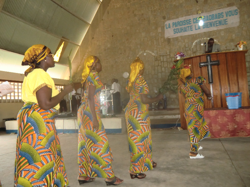 I sångerna sjunger man också med händer och armar och då kommer palmkvistarna till användning även vid kollektgången eller rättare sagt kollektdansen viftar man med sin palmkvist. Några hade även färggranna dekorationer i sin kvist. Idag var det två körer från grannförsamlingen Kiamvukyrkan och i gengäld var det fyra körer från Baobab i Kiamvukyrkan. Det var en stor kvinnokör och en manskör med något färre sångare. Kongoleserna är verkligt duktiga sångare och speciellt körsången har en framskjuten plats i gudstjänsten.