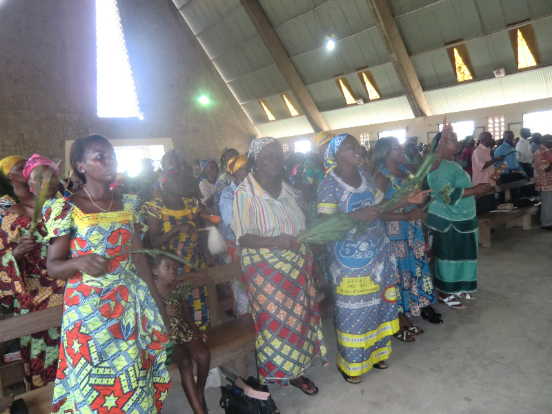 Tillsammans med Stig tog Bernt och jag taxi till Baobab-kyrkan. Yapeco hade åkt till den tidiga franska gudstjänsten. KL 10 började kikongogudstjänsten. Vi denna tidpunkt var det glest med deltagare. Det tar en timma innan de flesta kommit och vid 11-tiden var kyrkan ganska välfylld. Det är palmsöndag och många har palmkvistar i händerna.