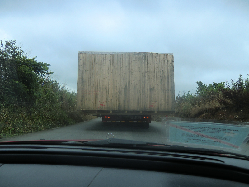 På ett ställe låg det någonstans mellan 20 – 30 ton ris på vägen. De höll nu på att lasta över säckarna till en annan lastbil. Strax utanför Kimpese hade en lastbil gått av vägen nedför en slänt. De höll nu på att lyfta upp den med en stor mobilkran. Vid ett tillfälle låg det en överlastad lastbil framför oss och på toppen av lasten satt det ett tiotal kongoleser. Rätt som det var exploderade dubbeldäcken på höger sida, ytterligare ett haveri.