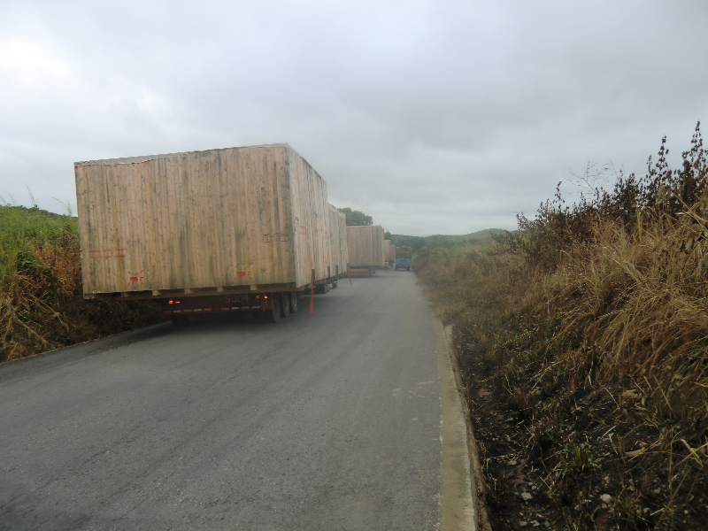 En intressant transport som vi kom ikapp var tre trailerbilar. De fraktade stora volymelement. Lasten var mellan 4 – 5 m bred och 3 – 4 m hög. Vägen stängdes av etappvis. Det fanns inte chans att möta ett sådant ekipage. Efter 7 km stannade de i ett samhälle och vi kunde passera.